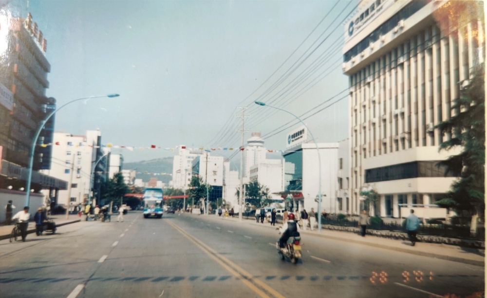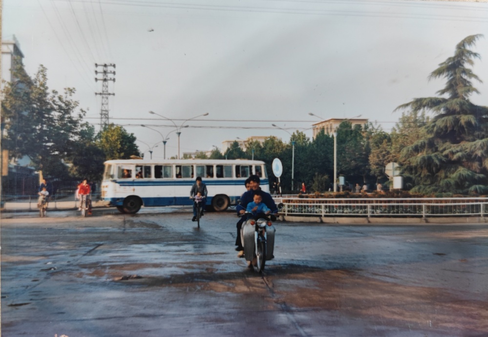▲90年代初,荊門市象山大道街景(?;坜D(zhuǎn)盤)。道路上車輛很少,公交車、摩托車、自行車是主流。