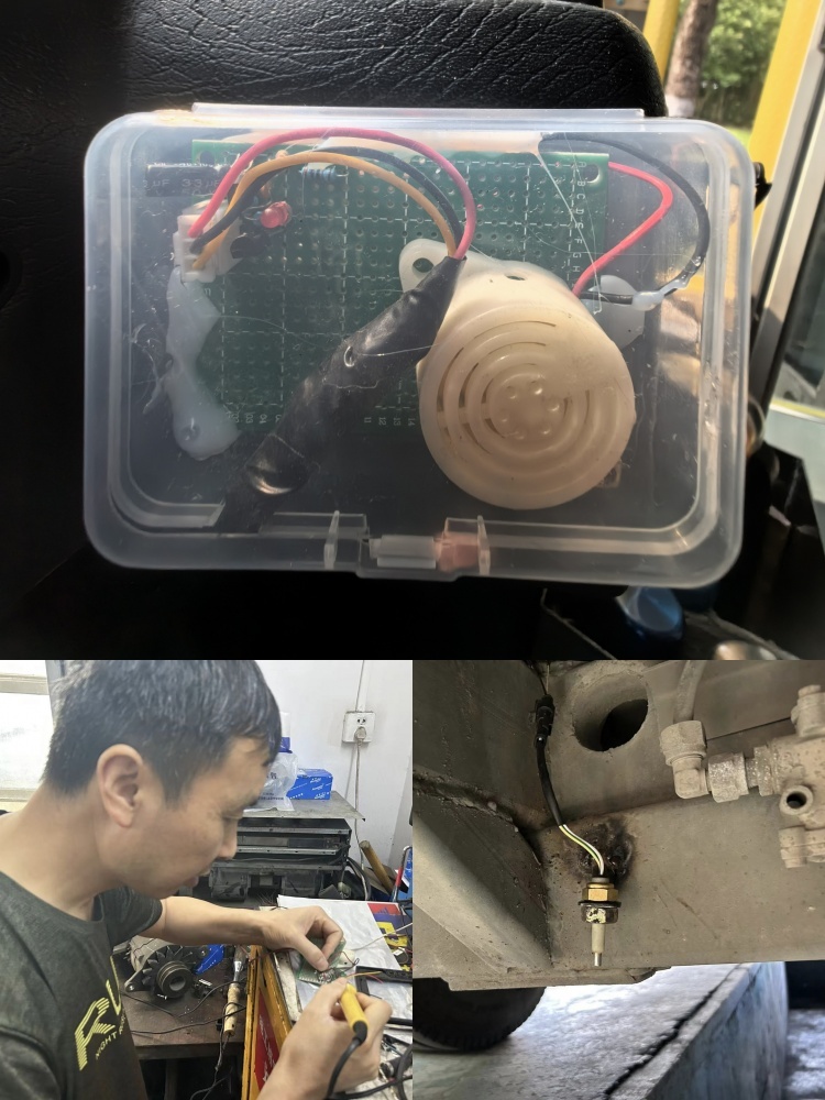 “涉水預警”裝置工作原理:涉水裝置由普通元器件及蜂鳴器焊接而成,在涉水路面通過傳感器泡水觸發(fā)蜂鳴器報警,進而提醒駕駛員。