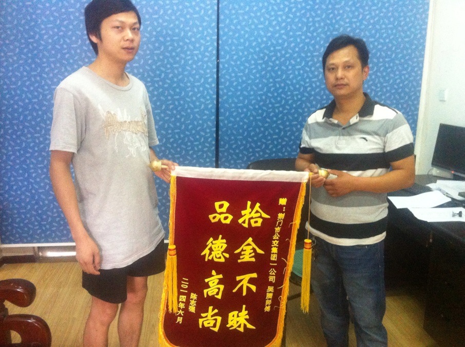 原來,15日下午2時許,1路公交車司機吳騰驅車途經城區(qū)長寧大道長寧8號廣場(中百倉儲)公交站點時,在馬路中央撿到一個黑色皮包,并及時上交到公交集團公汽一公司。公司負責人將皮包內身份證信息通過《荊門晚報》及荊門社區(qū)網絡媒體發(fā)布尋找失主陳先生信息,陳先生看到招領信息后,很快得知錢包的下落了,他說這(找回錢包)是他萬萬沒想到的。18日上午,陳先生順利地從公汽一公司負責人手中認領到丟失的錢包,并特意為吳師傅制作了一面"拾金不昧 品德高尚"錦旗表示謝意。