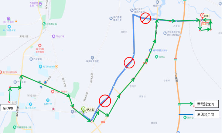 一.優(yōu)化調(diào)整33路公交線路走向 ◆首末站:楚天學(xué)校—旺林(小康南路北) ◆首末班時(shí)間:6:50—17:45 ◆線路走向:響嶺路—運(yùn)動(dòng)公園路—象山大道—深圳大道—培公大道—荊和大道—深圳大道—荊東大道—興化三路—格林北路—興化四路—小康南路 ◆??空军c(diǎn):楚天學(xué)校、雙喜街辦、運(yùn)動(dòng)公園路、萬(wàn)達(dá)廣場(chǎng)、掇刀檢察院、掇刀法院、掇刀公安分局、南城明珠、中國(guó)人民銀行、市氣象局、襄荊高速、雙泉社區(qū)、人民萬(wàn)福商貿(mào)城、人民一品花園、虎頭山、殯儀館、馮廟村、固潤(rùn)科技、東方雨虹、圣通石化、荊東消防、荊東大道興化五路口、潤(rùn)都制藥、興化三路西、興化三路中、興化三路盈德氣體、紐蘇萊、旺林、興化四路、小康南路北。 ◆取消原33路途經(jīng)荊和大道等路段站點(diǎn):荊和大道南、陽(yáng)光五路、陽(yáng)光四路、陽(yáng)光三路、化工產(chǎn)業(yè)園行政大樓。 二.優(yōu)化調(diào)整69路公交發(fā)班時(shí)間 ◆調(diào)整前 園博園東門(mén)發(fā)班時(shí)間:6:40、7:40、15:30、16:30、17:15 玲瓏輪胎發(fā)班時(shí)間:7:30、8:30、16:30、17:30、18:00 ◆調(diào)整后 園博園東門(mén)發(fā)班時(shí)間:6:40、7:20、15:30、16:30 玲瓏輪胎發(fā)班時(shí)間:7:30、8:20、12:20、16:20、17:30